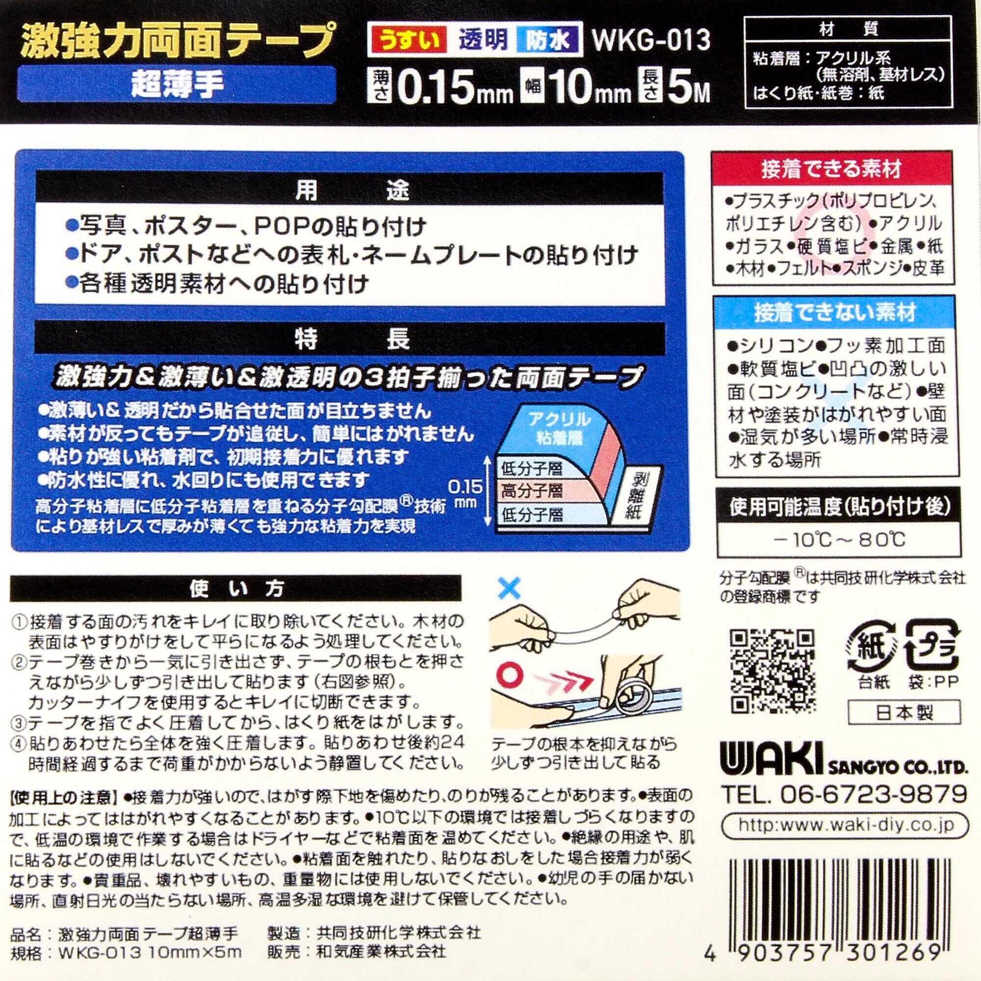 サイズ:幅10mm_スタイル:超薄手WKG-013 固定 取り付け 装飾品 薄さ0.15mmX幅10mmX長さ5m 超薄手 激強力両面テープ 和気産業