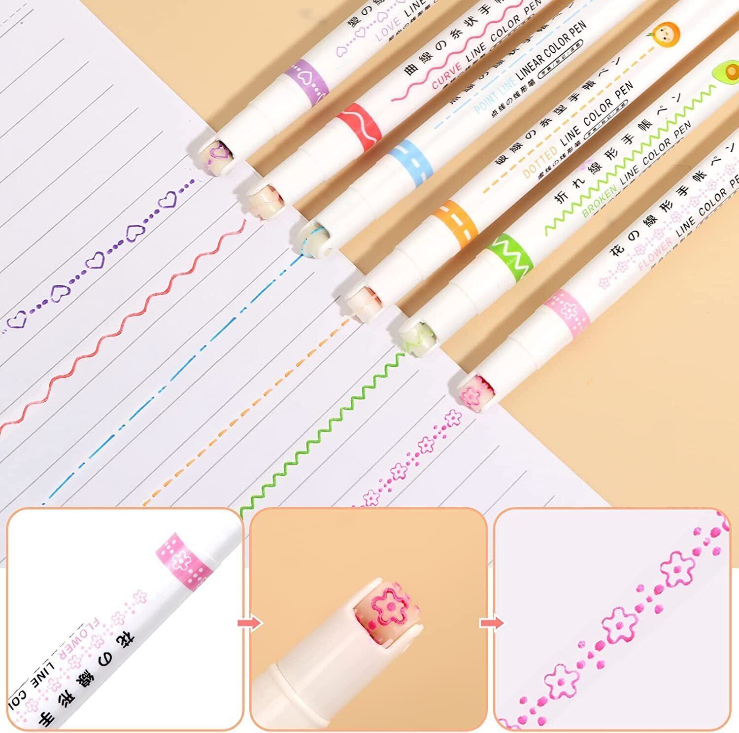 ✍【ユニークなカーブマーカー】曲線蛍光ペンは、ペンをテキスト上に滑らせるだけで、ローラースタンプが手書きでは難しい花模様、ハート模様、点線、波線、斜線など6種類の綺麗な線を簡単に引くことができます。