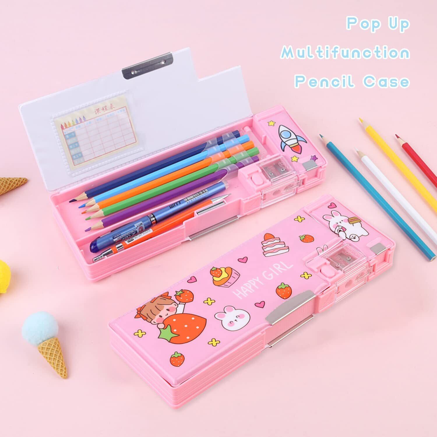 LilyBeauty ポップアップ 多機能ペンケース 女の子と男の子用 かわいい漫画のペンボックス オーガナイザー 文房具 シャープナー付き スケジュール 学用品 子供への最高の誕生日プレゼント【ピンク-ストロベリー】