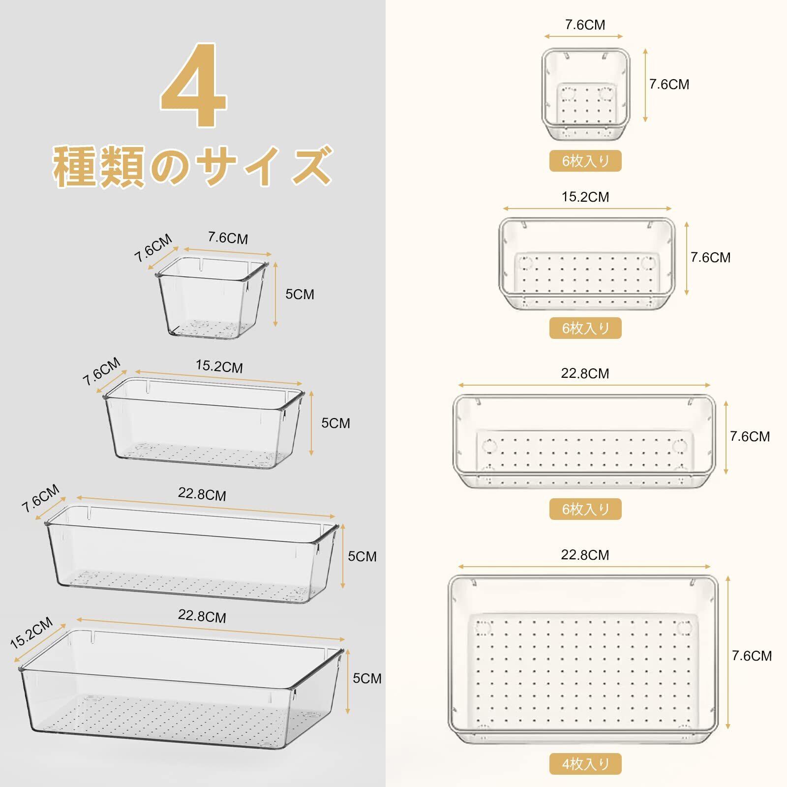 【4種サイズ】収納場所や習慣によってサイズ違いのトレーで自由に組み合わせて使用することも、個別に使用することもできます。引き出し用の仕切りトレーとしてだけでなく、浴室、オフィス、台所、卓上などにも使用可能です。