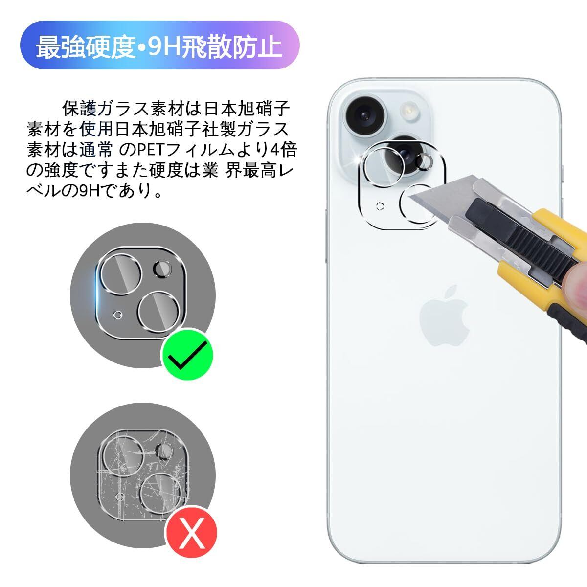 【2枚セット】 対応 iphone 15 / iphone 15 plus カメラフィルム 【日本旭硝子 硬度9H】 iphone15 / iphone15 Plus レンズフィルム カメラ保護フィルム アイフォン 15 / アイフォン 15 プロ レンズ保護ガラスフィルム 露出オーバー防止 レンズ保護 3D Touch対応 、高透過率 、気泡ゼロ 、防爆裂 、飛散防止 、衝撃吸収 、指紋防止 、ラウンドエッジ加工 、簡単貼り付け