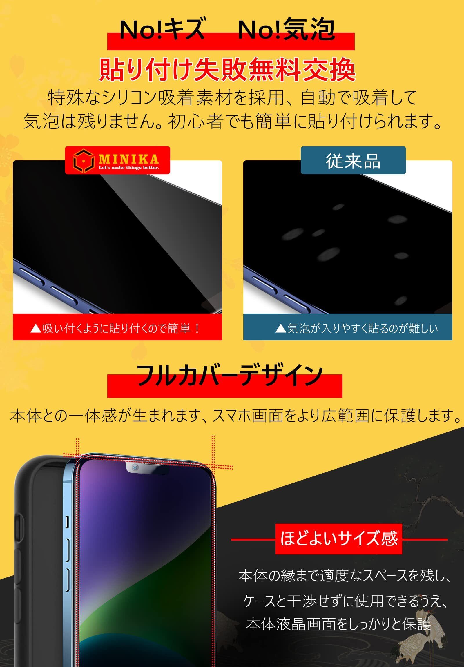 【指紋防止・飛散防止】 MINIKAのiPhone14のぞき見防止フィルム撥油コーティング加工されているため、ホコリや指紋など汚れにくくなっています。付着しても簡単に拭き取れます。画面を美しいままに保つ、スムーズな操作が可能です。ガラスフィルムは飛散防止加工されておりますので、万が一割れの場合でも、飛び散らず張り付いた安全の状態になります。