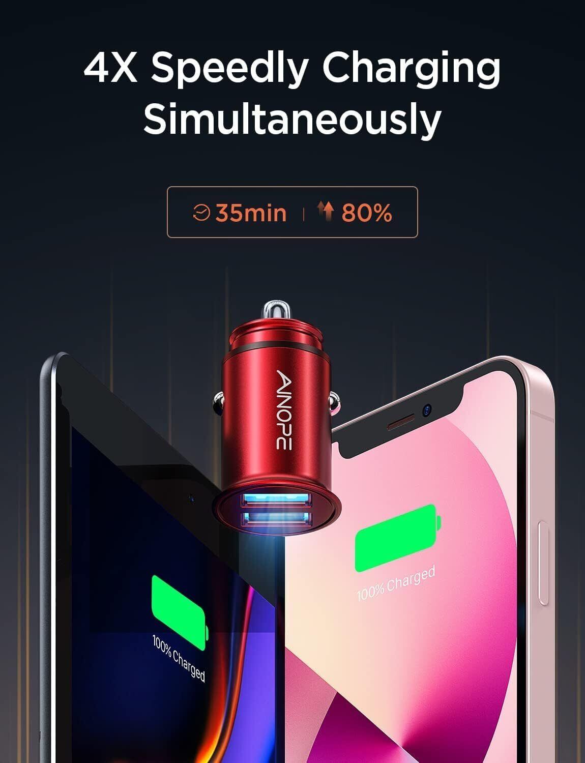 色:レッド4.8A 2ポート 24W 12V/24Vに対応 USB iPhone 充電器 14/13/SE/12/11/X/8 車 Xperia usb【全金属/軽量】カーチャージャー Samsung シガーソケット などスマホに対応 【2024超ミニデザイン】AINOPE ブラック-Red