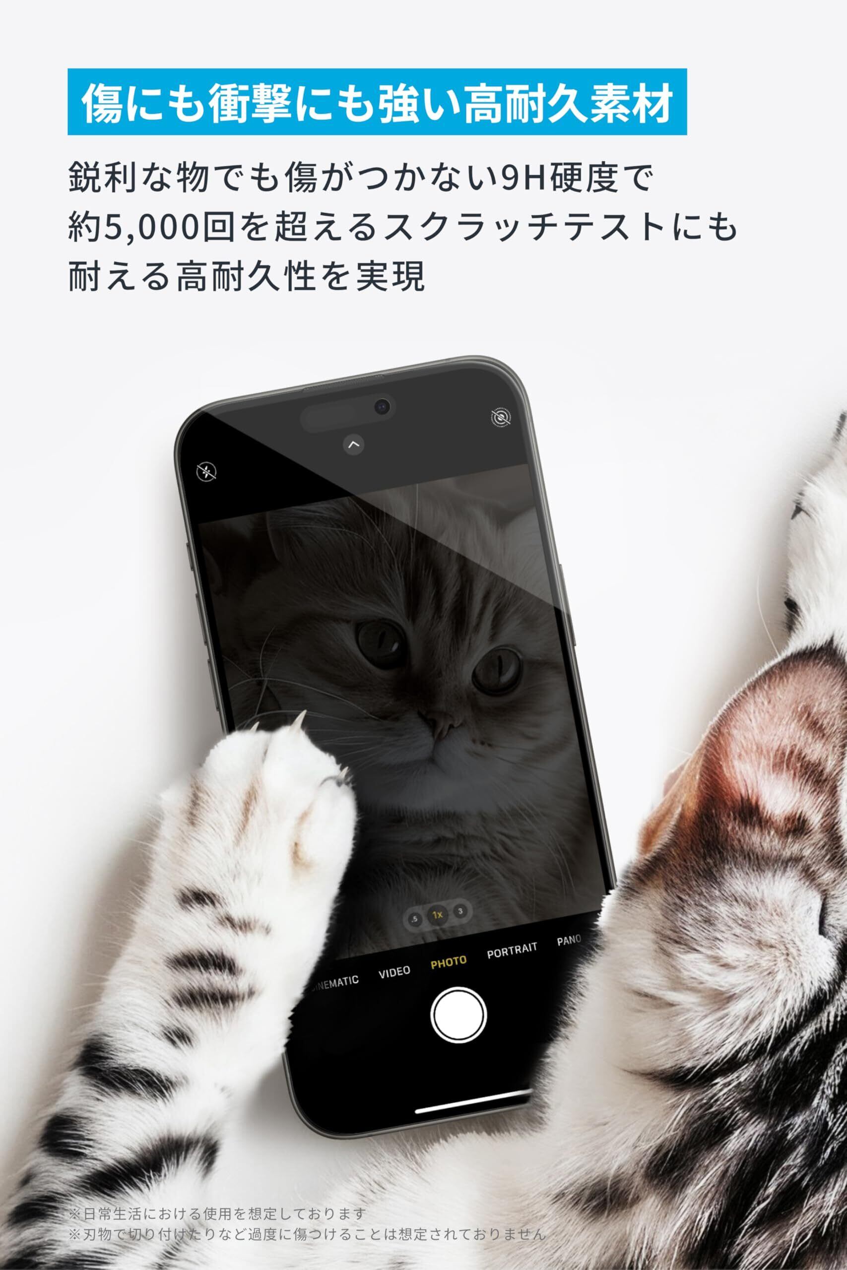 傷にも衝撃にも強い高耐久素材:鋭利な物でも傷がつかない9H硬度で約5,000回を超えるスクラッチテストにも耐える高耐久性を実現です。