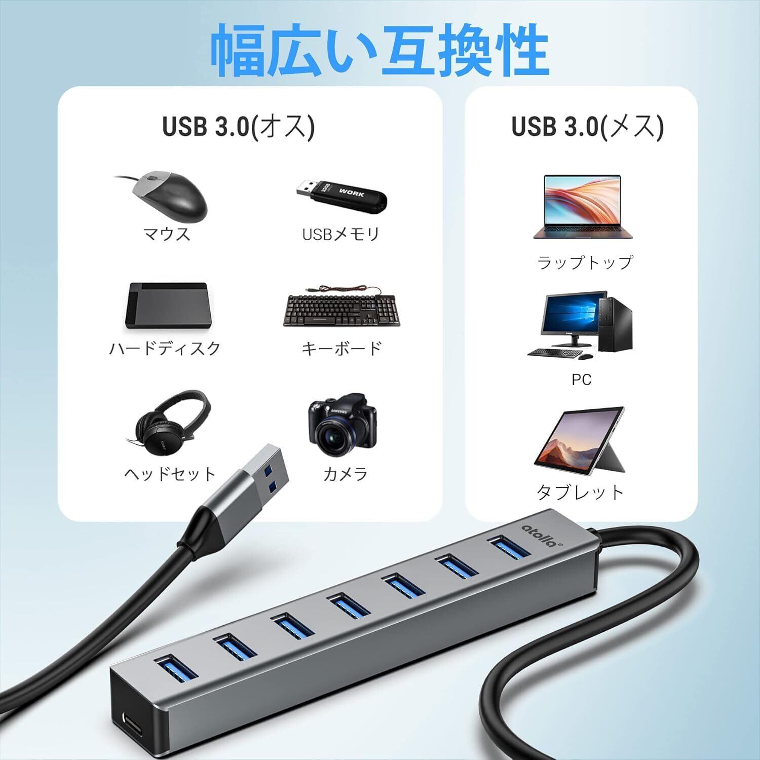 atolla USBハブ USB3.0 HUB 7ポート 100cmケーブル USB3.0ハブ USB 拡張 ウルトラスリム 5Gbps超高速転送 アルミニウム合金 軽量 追加5V/3A電力供給ポートWindows/Linux/Mac OS/Android/Chrome OS/PS4/MacBook等OSとPC対応 在宅勤務