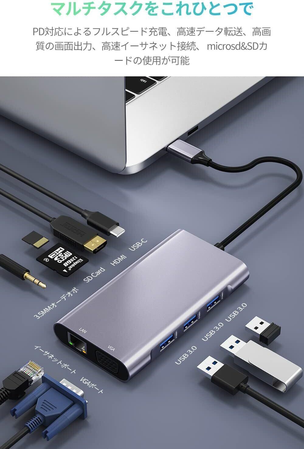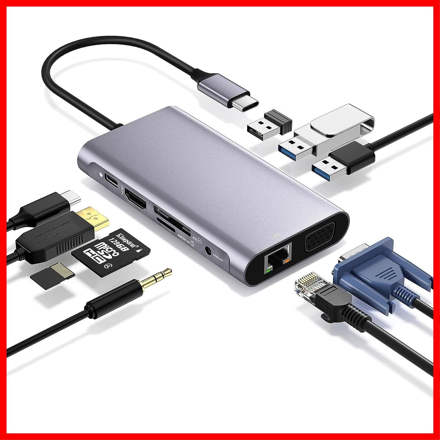【2023高機能版】USB C ハブ 10-in-1 トリプルディスプレイ Type C ドッキングステーション 変換アダプタ【4K HDMI出力ポート / 1080P VGAポート/ PD 100W 急速充電ポート / 1Gbps イーサネット / 3つの USB-A ポート / 3.5mmポート / MicroSD & SDカード スロット搭載】MacBook Pro Air / iPad Pro / Samsung Galaxy S20 / note 20 / ChromeBook / Surface Go / Pro7 / Matebook / ニンテンドースイッチ / Switch / USB C デバイス対応