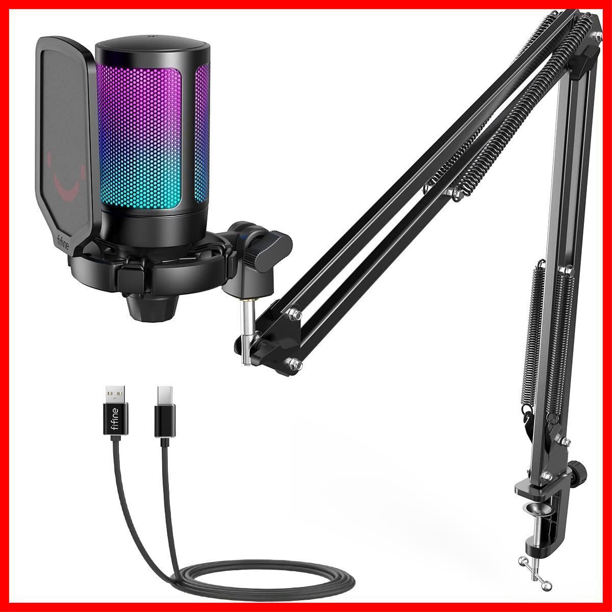 FIFINE USB コンデンサーマイク RGB光り カーディオイド指向性 プラグ&プレイ パソコン/プレステマイク USBケーブル付き ワンタッチミュート YouTube Skype Discord Zoom 録音 ゲーム実況 ボイズチャット ライブ配信 テレワーク web会議に最適 PCのWindows MacOS PS4/PS5対応 AmpliGame マイクロホンキット A6T