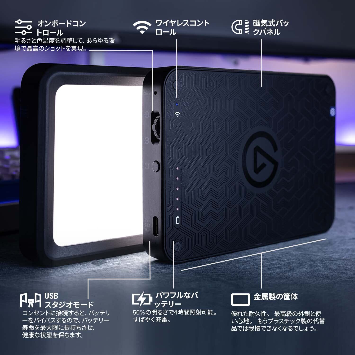 オンラインで輝く。いつでも。どこでも。マルチレイヤーで光を拡散するエッジ型、バッテリーまたはコンセントから駆動可能。Key Light Miniはスタジオから街中まで、どこにいてもあなたを美しく見せます。¼インチネジと内蔵マグネットのおかげで、三脚や金属製の表面に取り付けられます。明るさと色温度の調整は、オンボードで、または、iPhone、 Android、Mac、またはPCからアプリで実行できます。Key Light Miniがあれば、どんな場所も完璧な作業場へと変えてしまいます。 技術仕様 ライト: 明るさ:800ルーメン、調光可能 色範囲:2900 - 7000 K、調整可能な CRI > 94 % バッテリー:3.7 V、4000 mAh LiPo 充電:USB-C、最高3 A、5 Vの高速充電 消費電力:最高 15W サイズ:147 x 100 x 17 mm / 5.79 x 3.93 x 0.67 in 重量:300 g / 0.66 lbs Wi-Fi:2.4 GHz / 5 GHz、802.11 a/b/g/n 対応暗号化:WPA2 + AES、WPA + TKIP/AES システム要件 初期設定時:Wi-Fi接続されたPCまたはMac、iOSまたはAndroidデバイス 最低 2.4 AのUSB電源 互換性 Windows 10 (64ビット) macOS 10.14 iOS 13 Android 6.0、またはそれ以降
