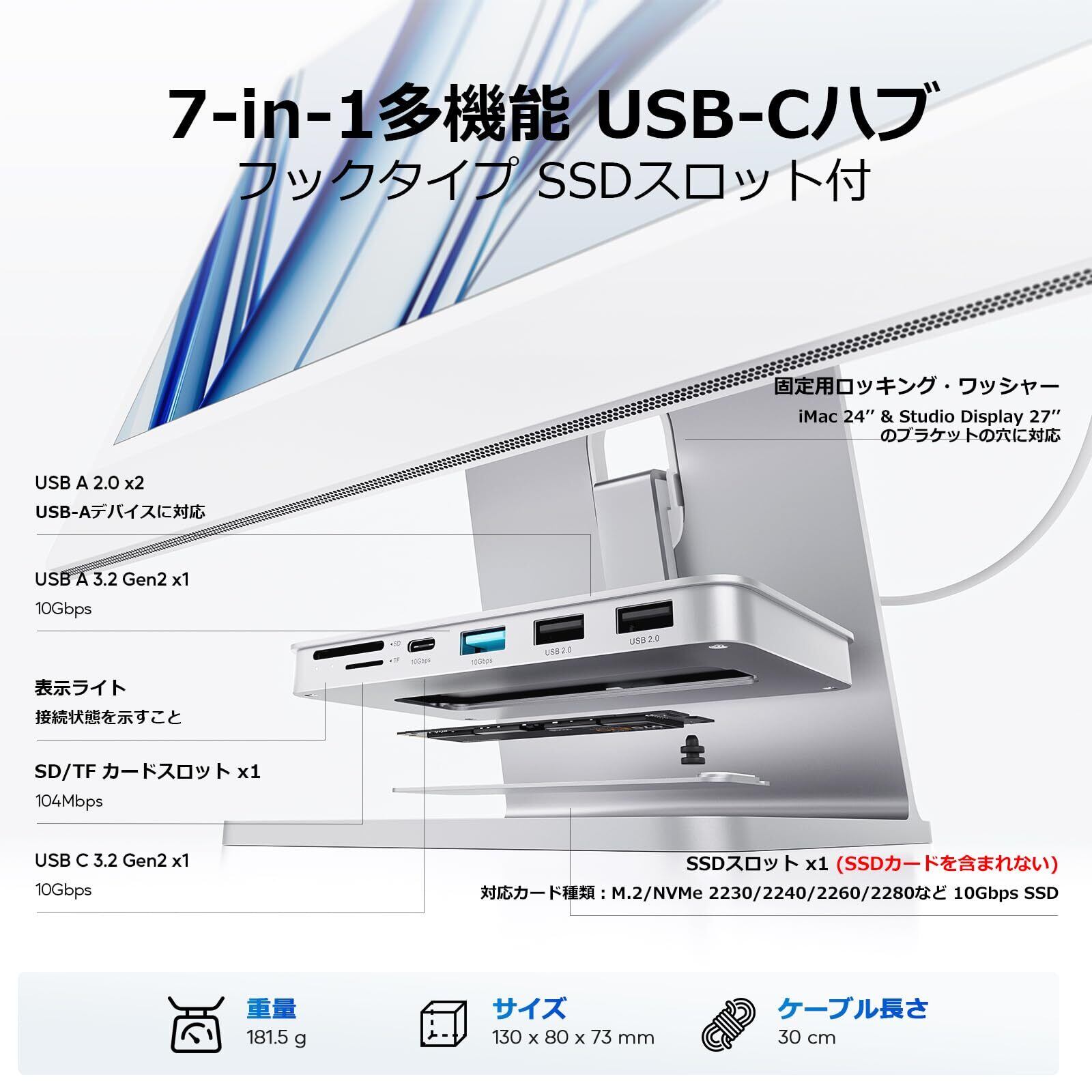 PULWTOP 7 in 1 USB C ハブ iMac 24インチ 2021/2023用 M.2 NVMe SSDスロット付 (SSD含まれない) iMac アクセサリー フック式 USB C Hub 1×USB-C 3.2, 1×USB-A 3.2, 2×USB-A 2.0, 1×MicroSD/TF カードリーダー iMac M1/M3 Studio Display 27インチ用 シルバー