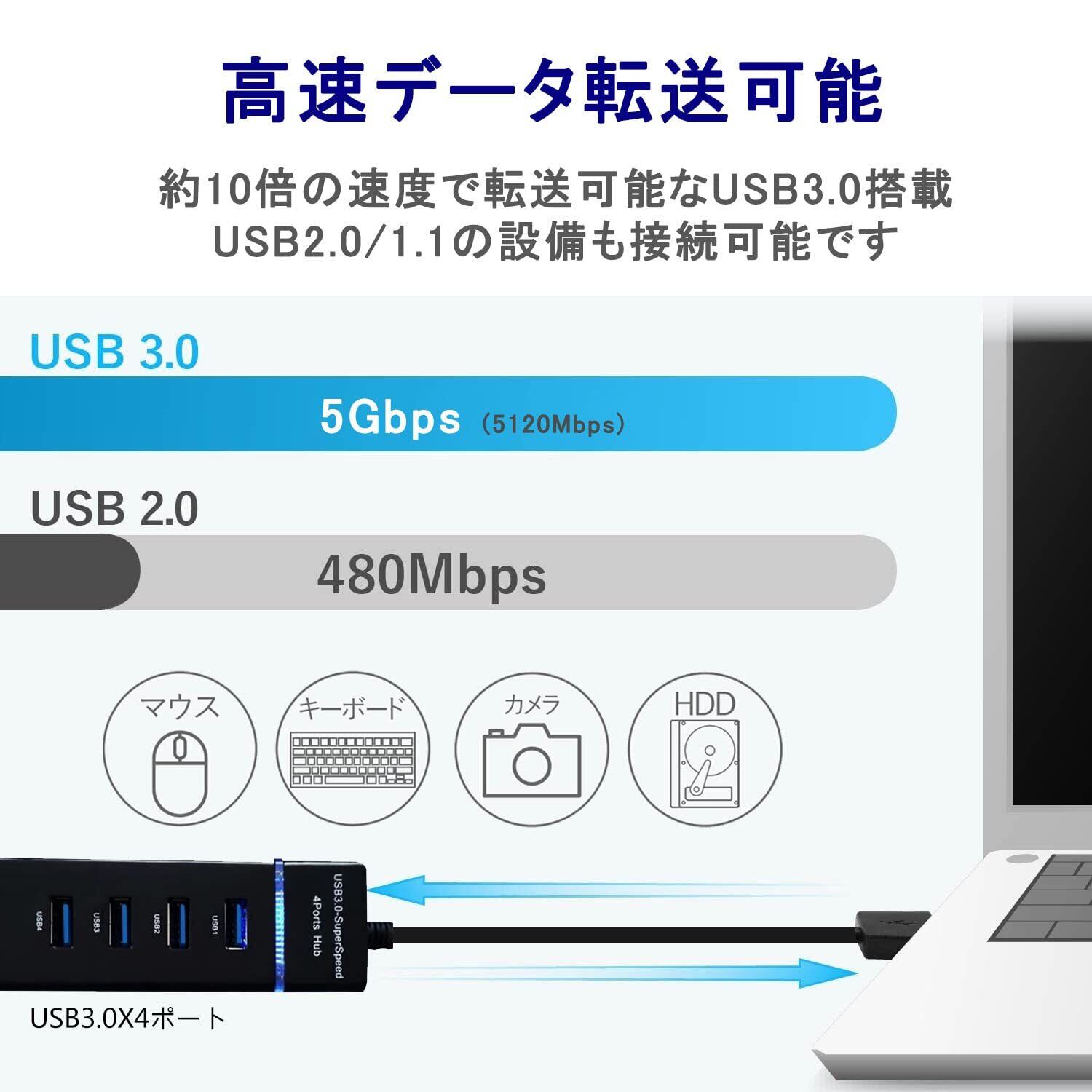 【高速データ転送】USB3.0ポートX4ポート(5.0Gbps 約640MB/s)の搭載、高速データを転送できます。転送速度5Gbpsと従来のUSB2.0の約10倍の転送速度(理論値)を実現するUSB3.0に対応したUSBハブです。