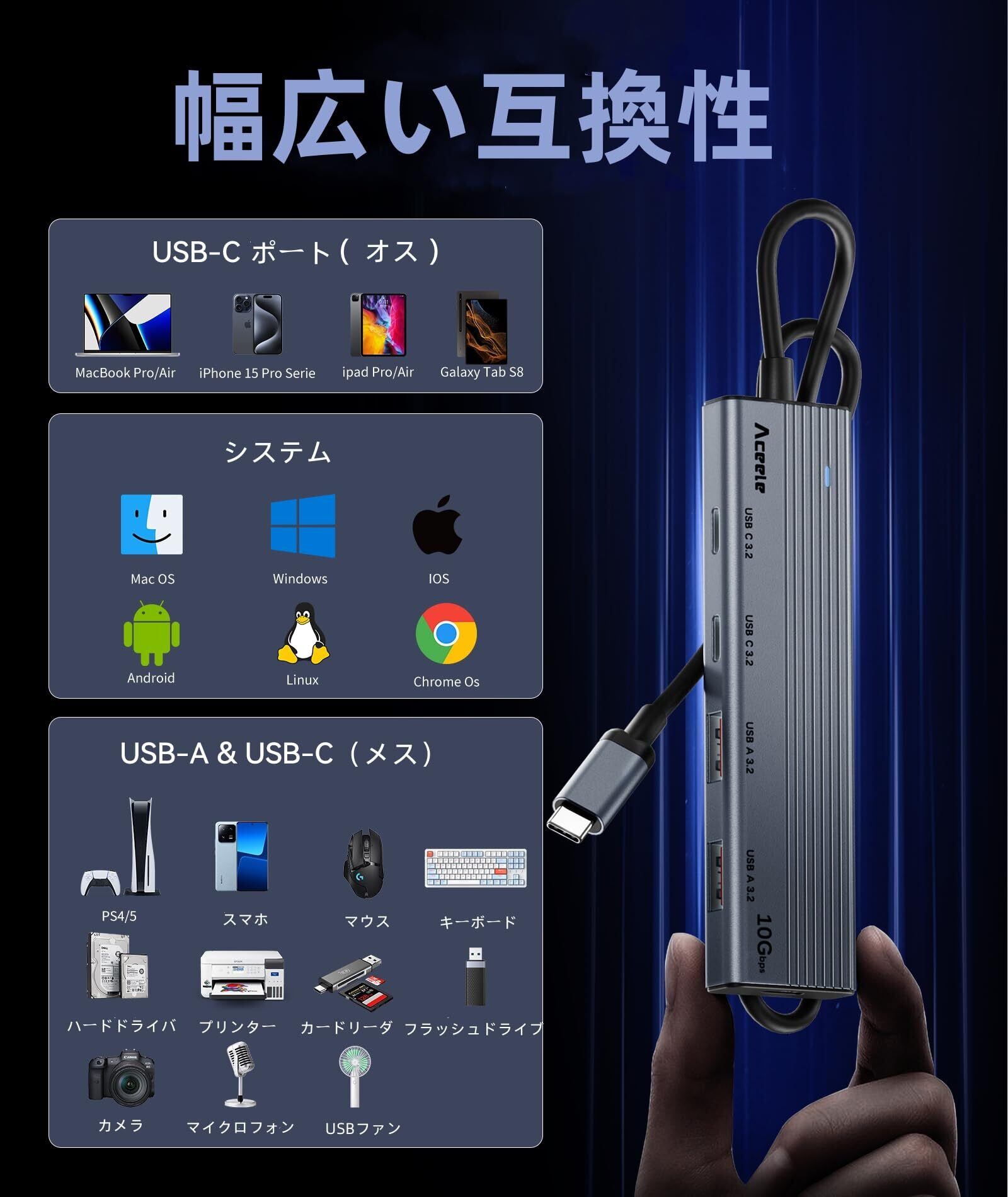 Aceele USB Cハブ 10Gbps 100W PD急速充電 5ポート拡張 USB ハブ 100cm ケーブル付き 3.2 データポート超高速伝送 2xUSB-A ポートと 2xUSB-C ポート付き MacBook Air/Pro、Surface Pro、XPS、PC、フラッシュドライブ、iPhone 15/15 Pro/用