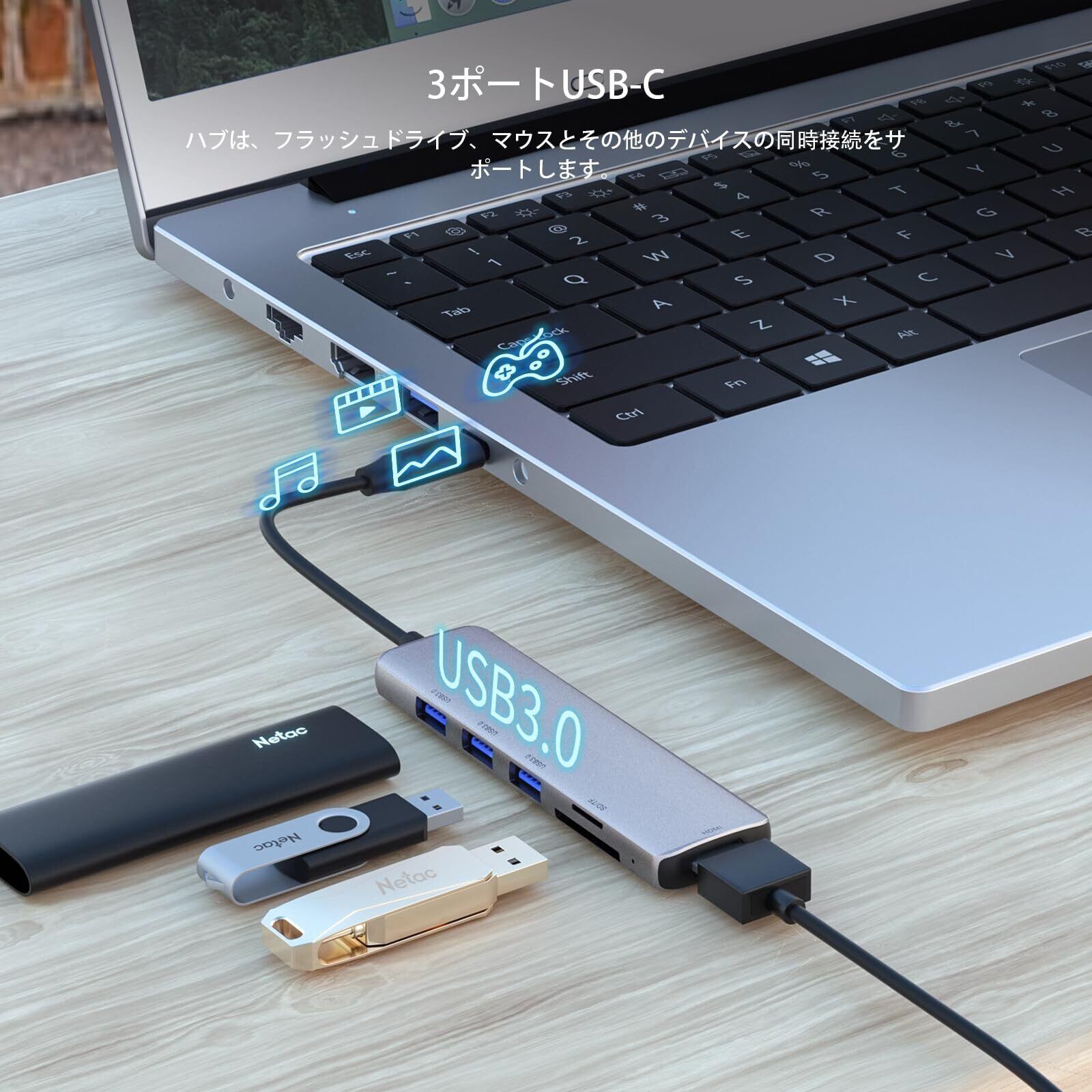 Netac USBハブ 6-in-1 Type C アダプタ (USB 3.0 x 3 TF/SD カードスロット HDMI 4K 30Hz) を備えたノートパソコン、タブレット、携帯電話などに対応 USB3.0/2.0対応 アルミ合金製(色)グレー ドッキングステーション WF14