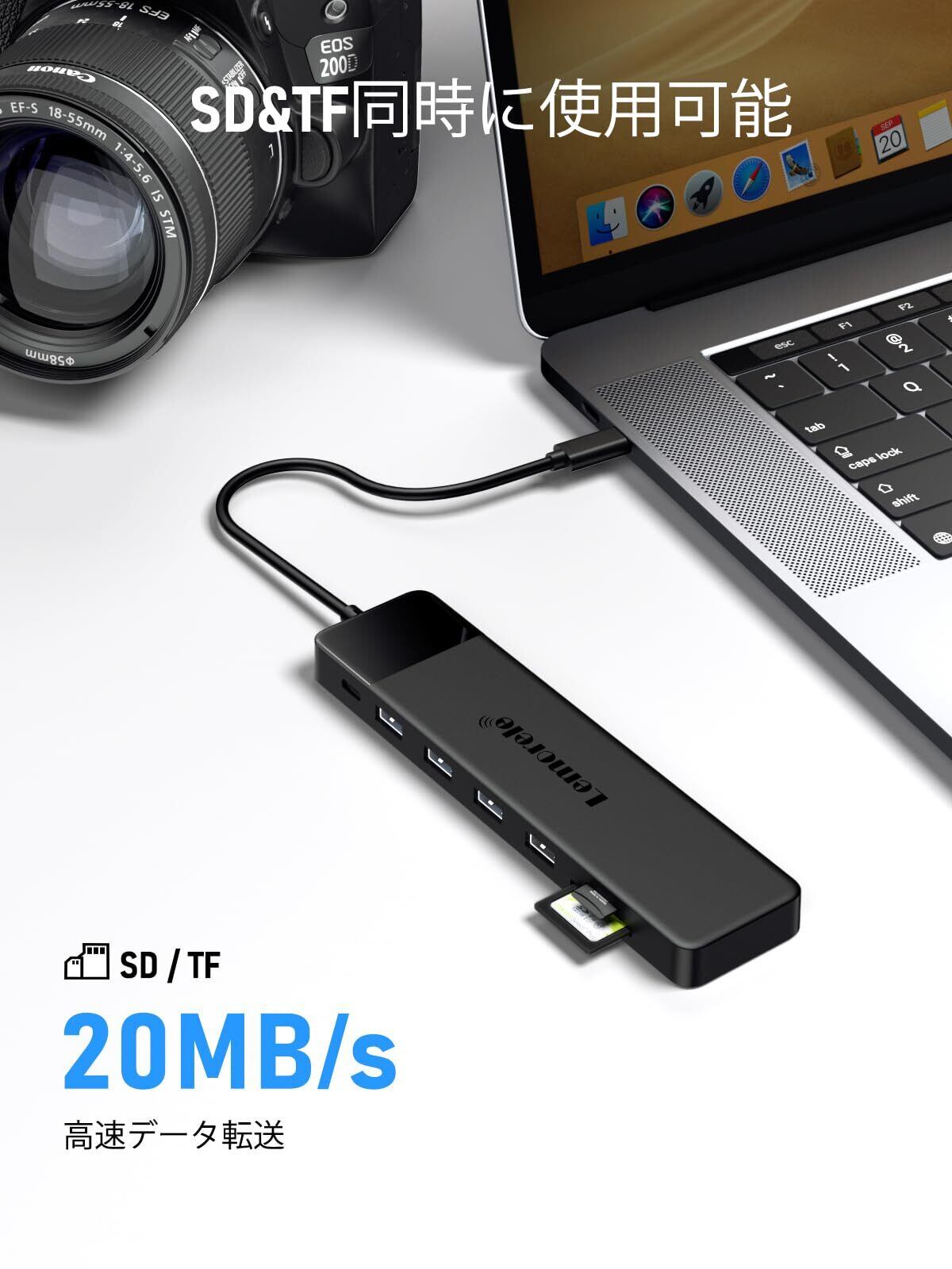 【SD/TFカードリーダー】:デジカメラなどで撮影した写真や映像を取り込むことができます。カメラに美しい瞬間の写真やVlogoを記録し、メモリーカードのビデオからデータをカードスロットから読み取ります。【3.5mmオーディオポート】オーディオジャックの搭載で、音楽にも妥協無し。イヤホンやスピーカに接続し、音声の出力をサポートします。