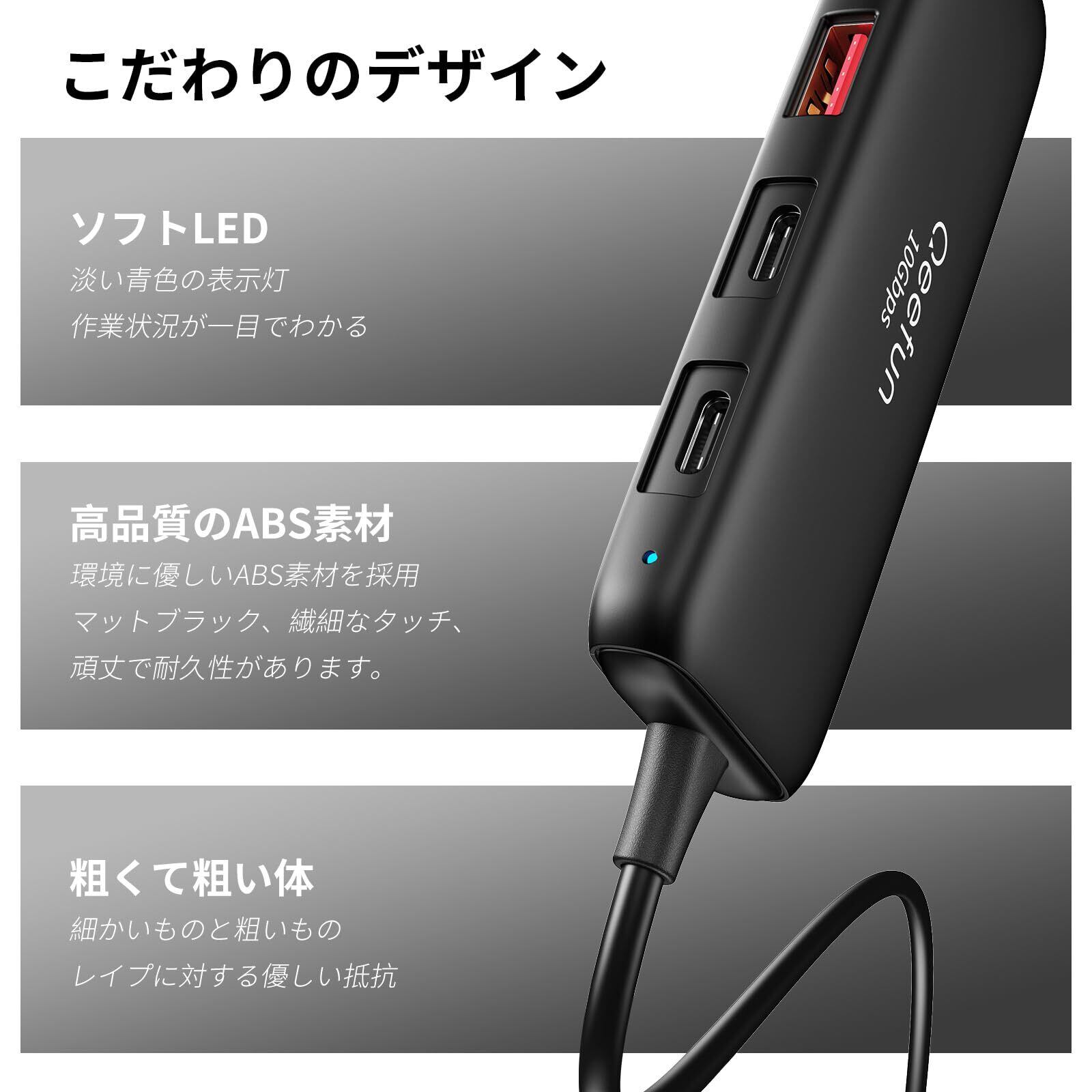 Qeefun USB ハブ 10Gbps 4ポート、120cm ケーブルUSB 3.2 Gen 2 ハブ 付き 2xUSB-A ポートと 2xUSB-C ポート 付き100W PD電源ポート電力充電 ノートパソコン MacBook Air/Pro Pro Surface Pro、XPS、PC、フラッシュドライブ、iPhone 15/Pro/Pro Max用