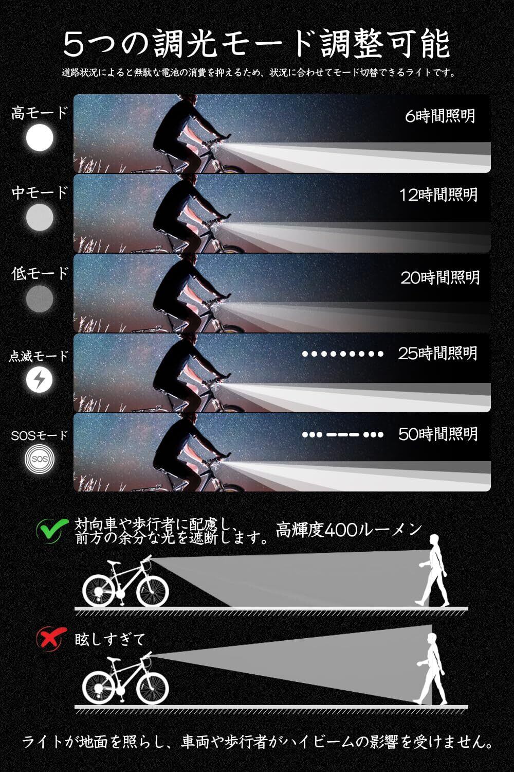 【高輝度LEDライト&5段階調光モード&防眩機能】自転車ヘッドライトは、高輝度LED12個を搭載しており、最大400〜1200ルーメンの明るさを実現し、約300メートル以上先を効果的に照らします, これにより夜間の個人安全性が向上し、1つのボタンで5つのモード(高輝度モード⇒中輝度モード⇒低輝度モード⇒点滅モード⇒SOSモード)を切り替えることができます