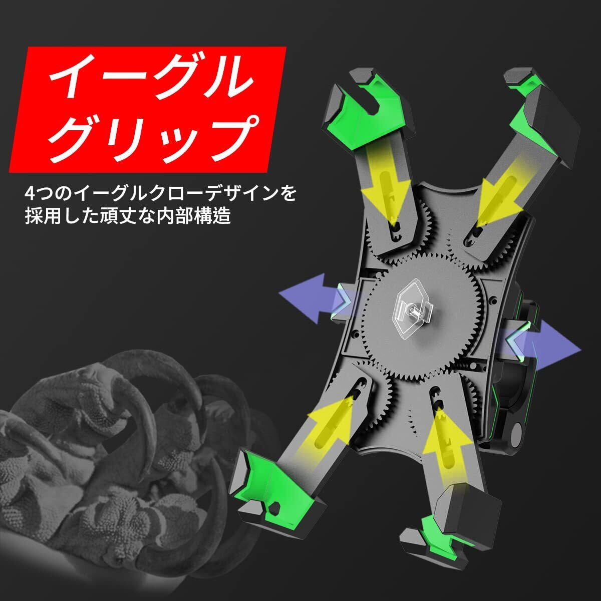 【 頑丈で安全 】 四隅のクランプデザインを採用し、スマホをしっかり固定します。各クランプの裏側にゴムパッドが付いており、スマホを衝撃から守ります。走行中に振動があってもスマホを滑らせたり落としたりしません。