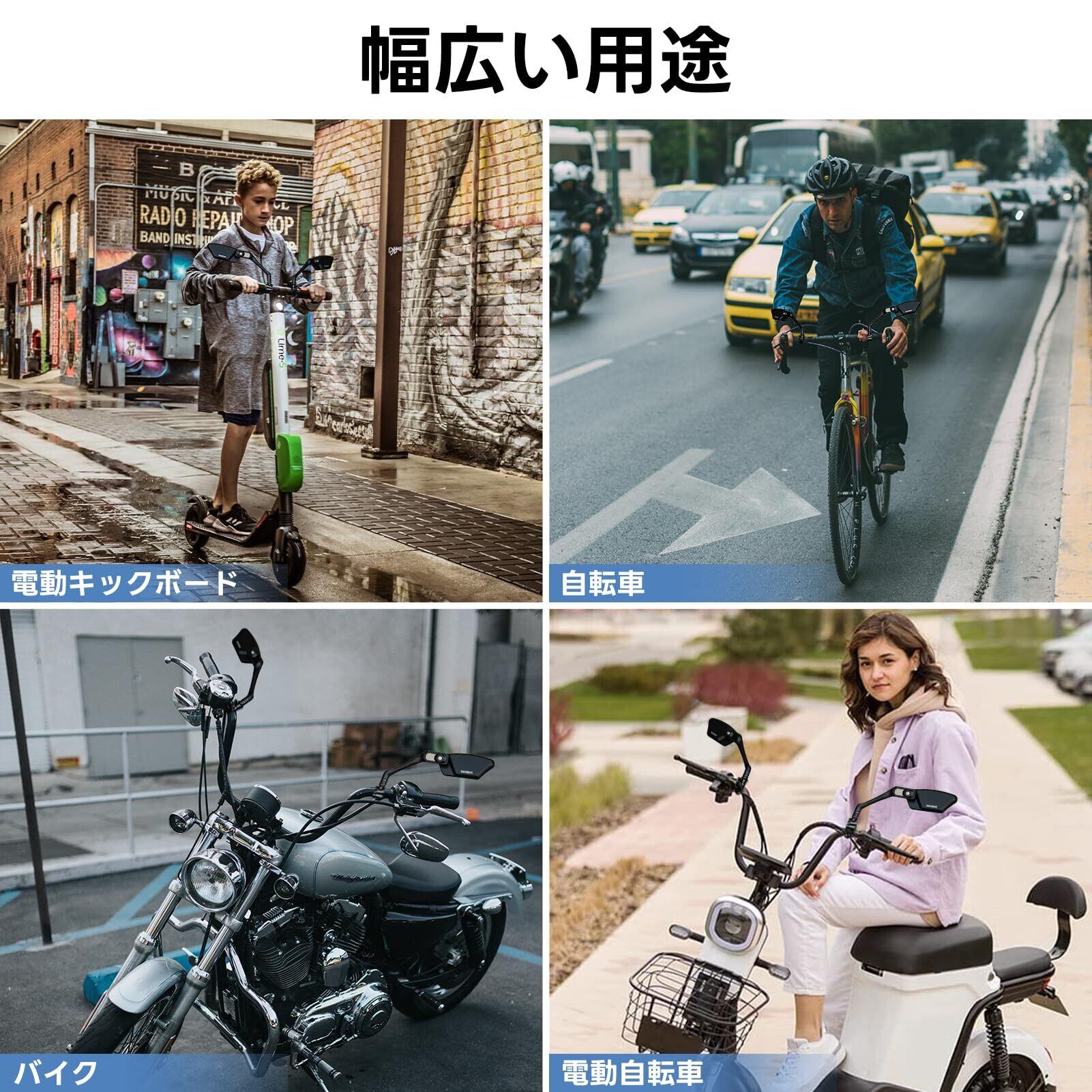 【取り付け簡単&適用範囲】単個重量僅か126g、六角レンチが付属して取り付け簡単です。自転車バックミラーはどの21~26mm径のハンドルバーにも適しています。ロードバイク、MTB、マウンテンバイク、折りたたみ車、電動自転車、バック、キックボードなどにも使えます。Japan bicycleは、カスタマーに対し、最高水準のカスタマーサービスを提供することをお約束します。 自転車バックミラーに関して不満のところがあれば、こちら返金返品の対応ができますので、遠慮せず連絡をお願いいたします。