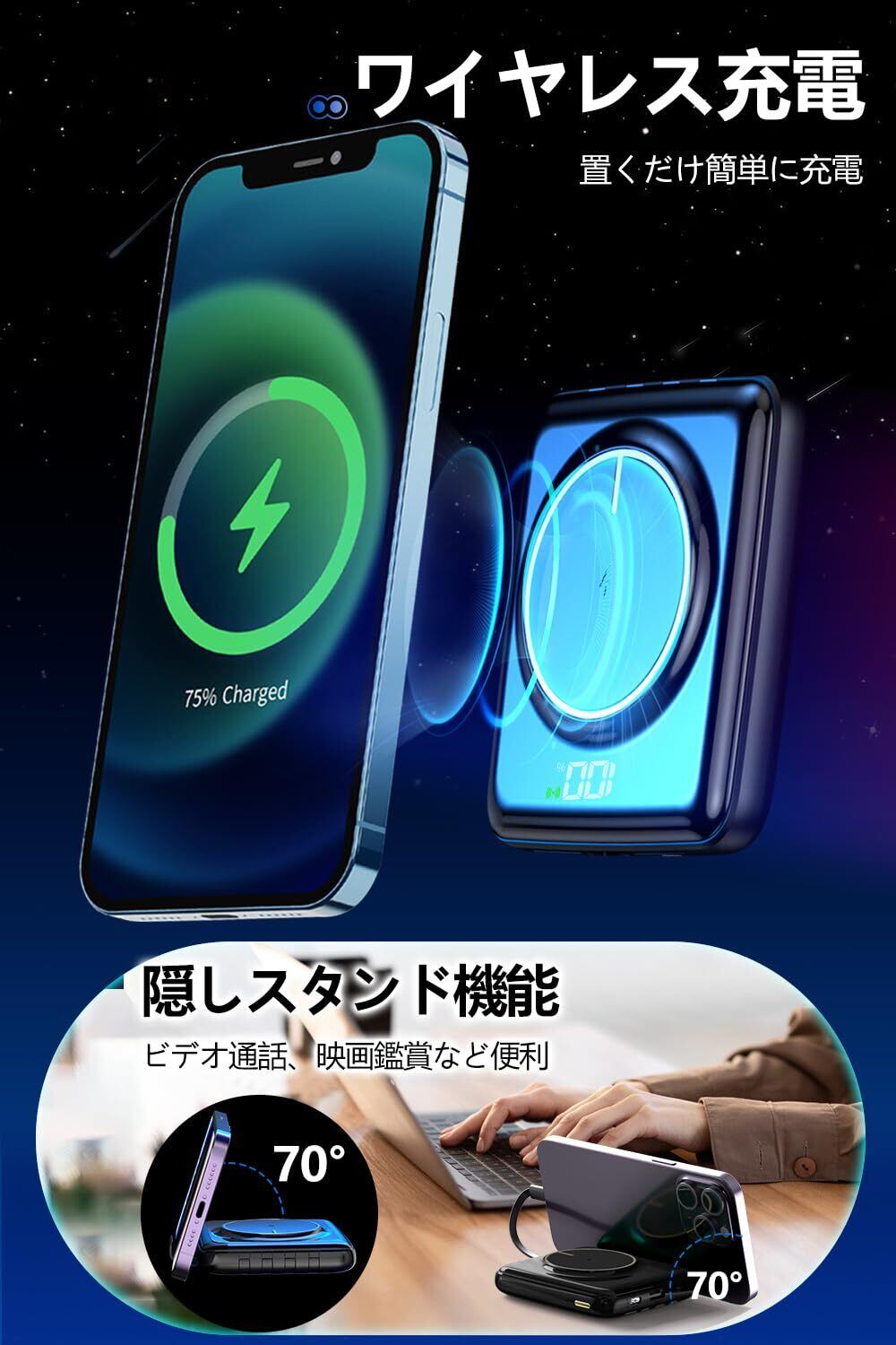 特徴 内蔵ケーブル, ポケットサイズ, 軽量, 高速充電, ワイヤレス充電
