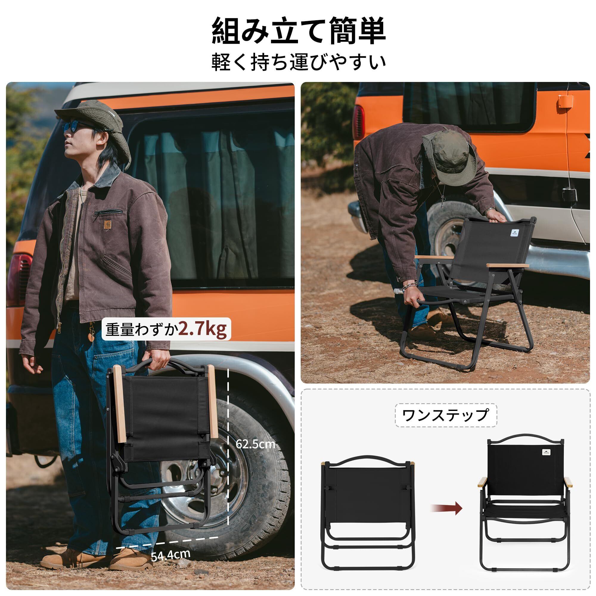 【組み立て不要&持ち運びに便利】分解する必要がなく、力も要らなく、ワンステップで1秒で設営・収納可能です。収納後幅7.5cm、収納しない時に、コンパクトに隙間に収納しても楽々です。全体重量はわずか約2.7kgで、市販の同様のアウトドアチェアより軽く、女性一人でも持ち運びしやすいです。