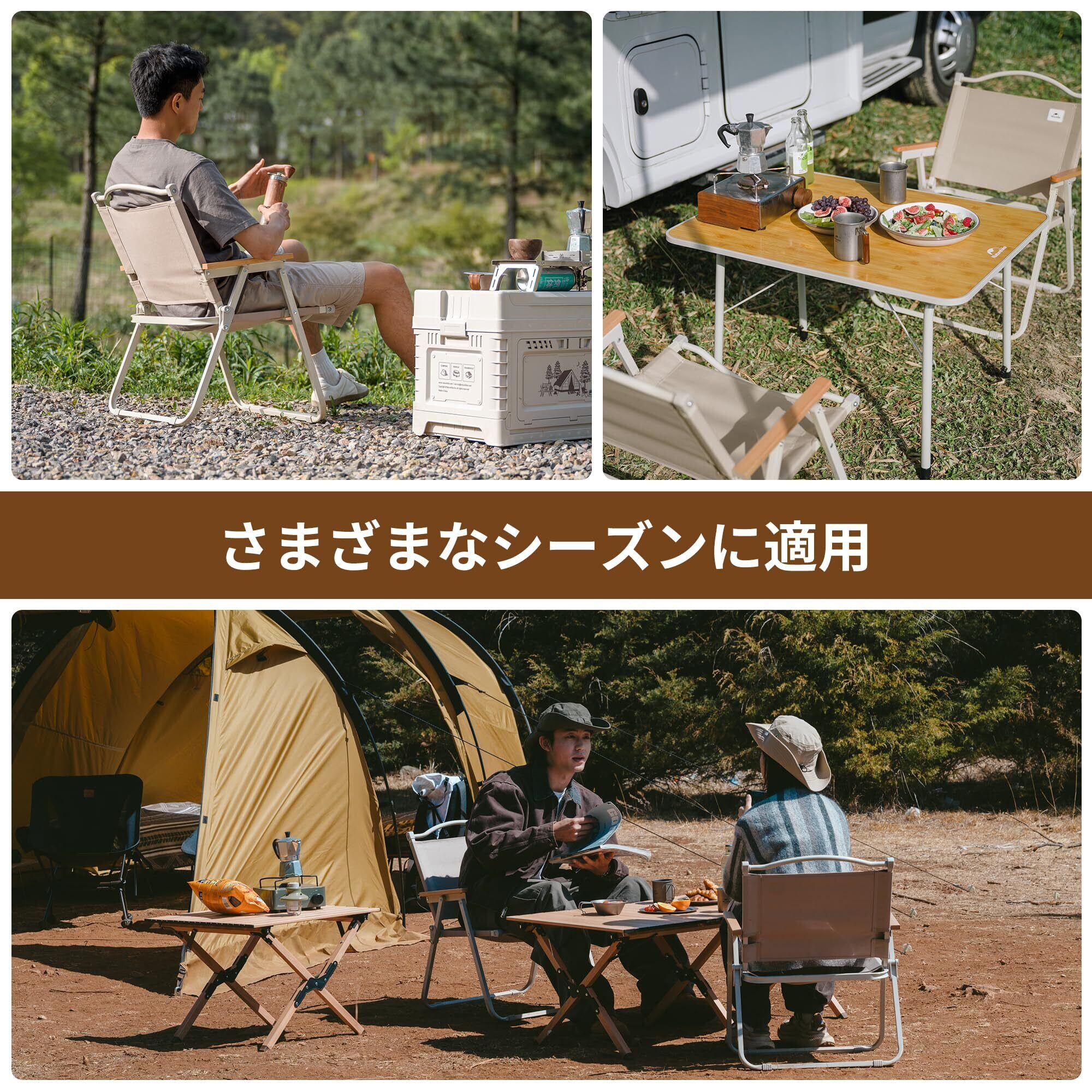 【高品質な素材】フレームは高品質なカーボンスチールで使われ、多層加工により、傷や磨耗に強く、耐腐食性と耐久性に優れていますより安定で耐荷重は約120kgです。600D二層オックスフォード生地で、座面はフラットでシワになりにくく、耐摩耗性と耐引裂性が高いです。ブナ材の手すりはバリのない優しい質感があり、アウトドアにも室内使用にもオススメです。