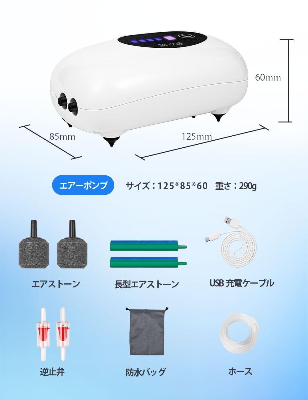 エアーポンプ 釣り/水槽 ポンプ USB充電 電池内蔵 消音30db 携帯式 酸素提供ポンプ 連続25時間 間欠モードでは50時間動作できます【連続モード・間欠モード・停電時自動起動モード】