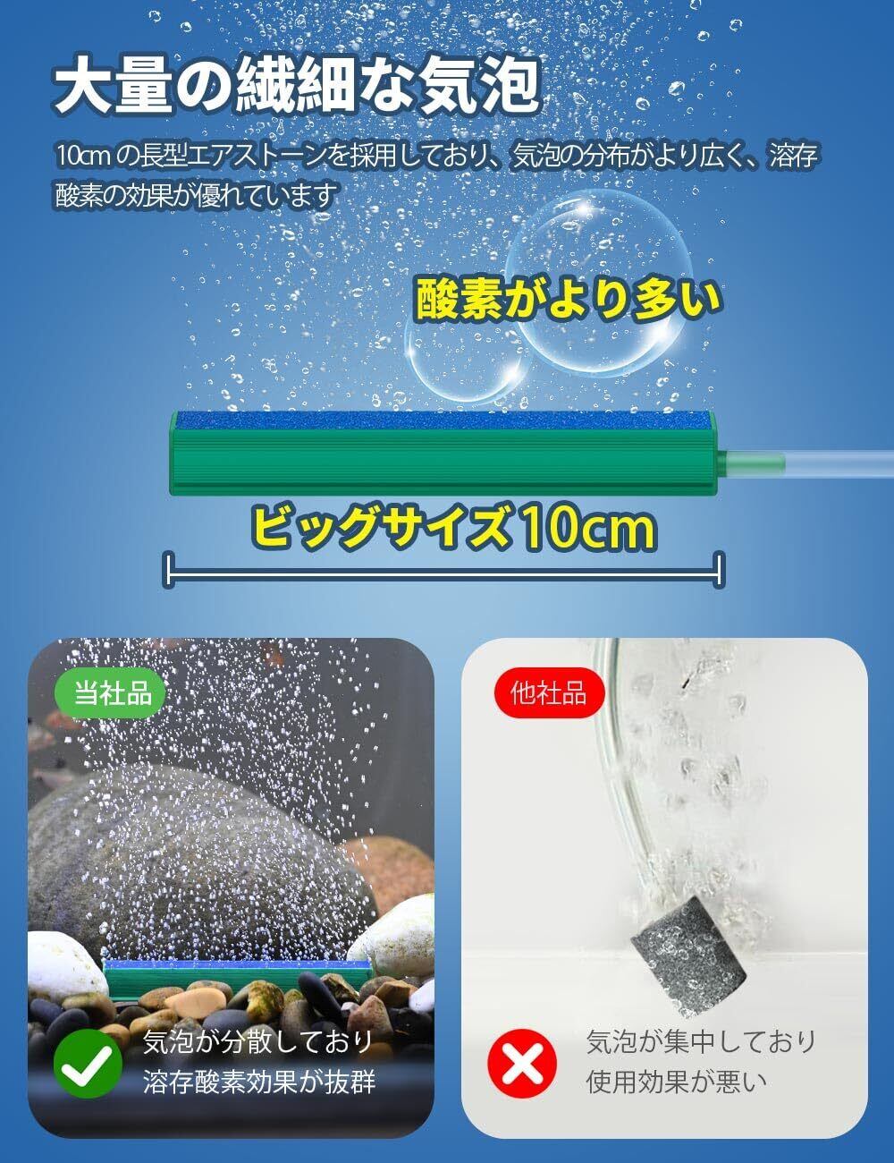 【ダブル吐出口・USBで給電】エアポンプは最大吐出量が1.2L/min*2で、4800mAhバッテリーを内臓しております。水深60cmにおすすめします。連続25時間、間欠モードでは50時間動作できます。付属品にはMicro USB充電ケーブル、チューブ、ストーン、逆流防止弁、防水収納袋が入っています。このエアポンプは全世界で販売台数が20万台を超えました。お客様にフィードバックしていただいた問題に対して、エンジニアにより何度も改善を行い、非常に安定した性能を実現しました。