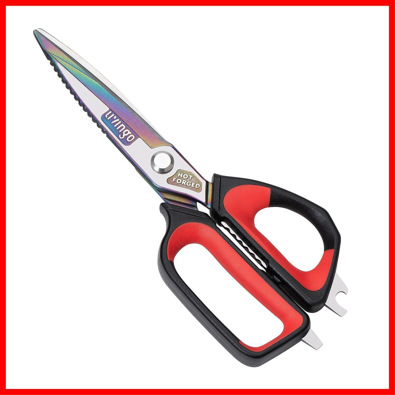 LIVINGO 高耐久キッチンバサミ大きい 鋭いステンレス鋼 チタンコーティング 熱間鍛造切断刃 ゴム製 ソフトグリップ ナッツクラッカー ボトルオープナー 波状刃 多目的料理用はさみ 肉、鶏肉、家禽、魚の骨、野菜に最適 食器洗い機対応 241mm