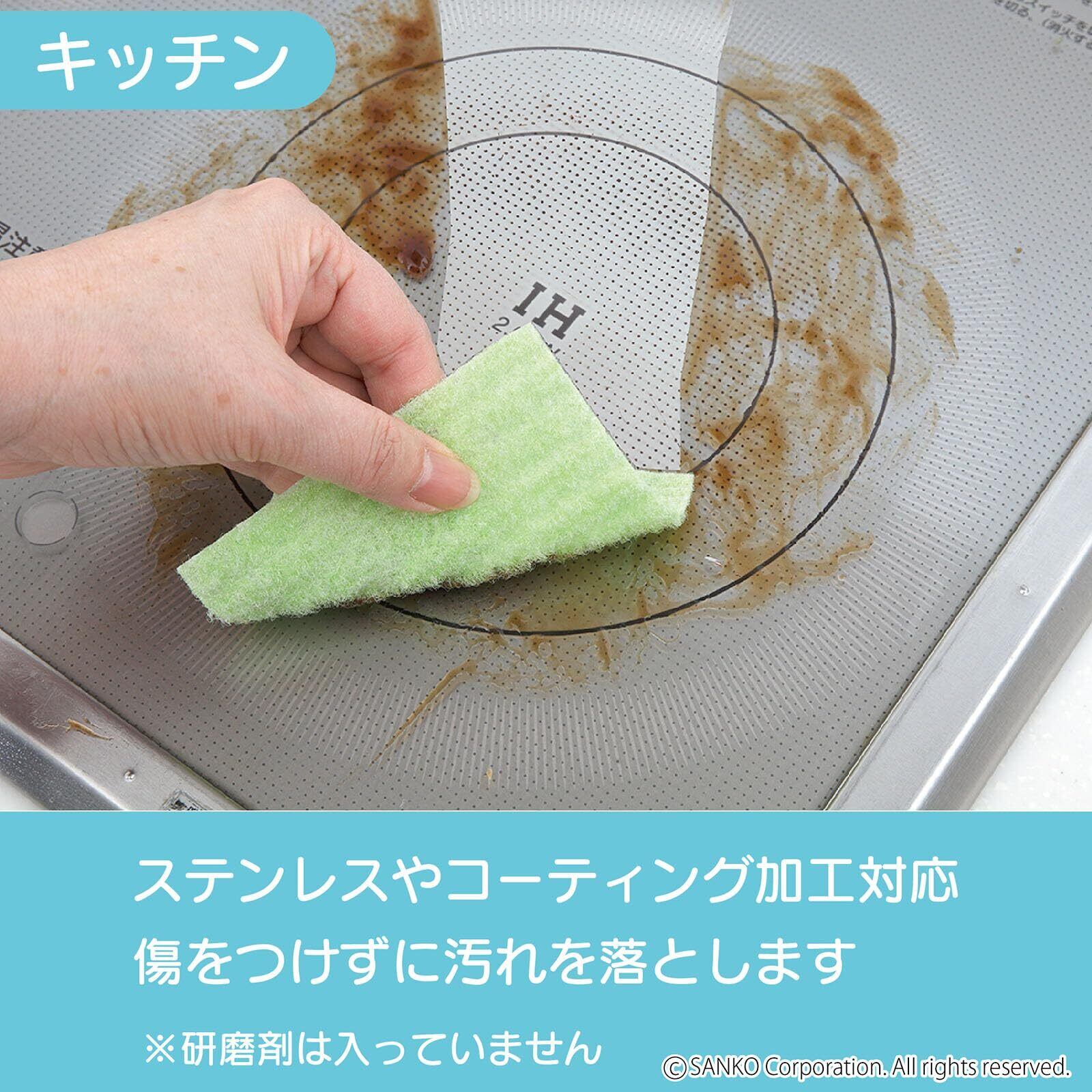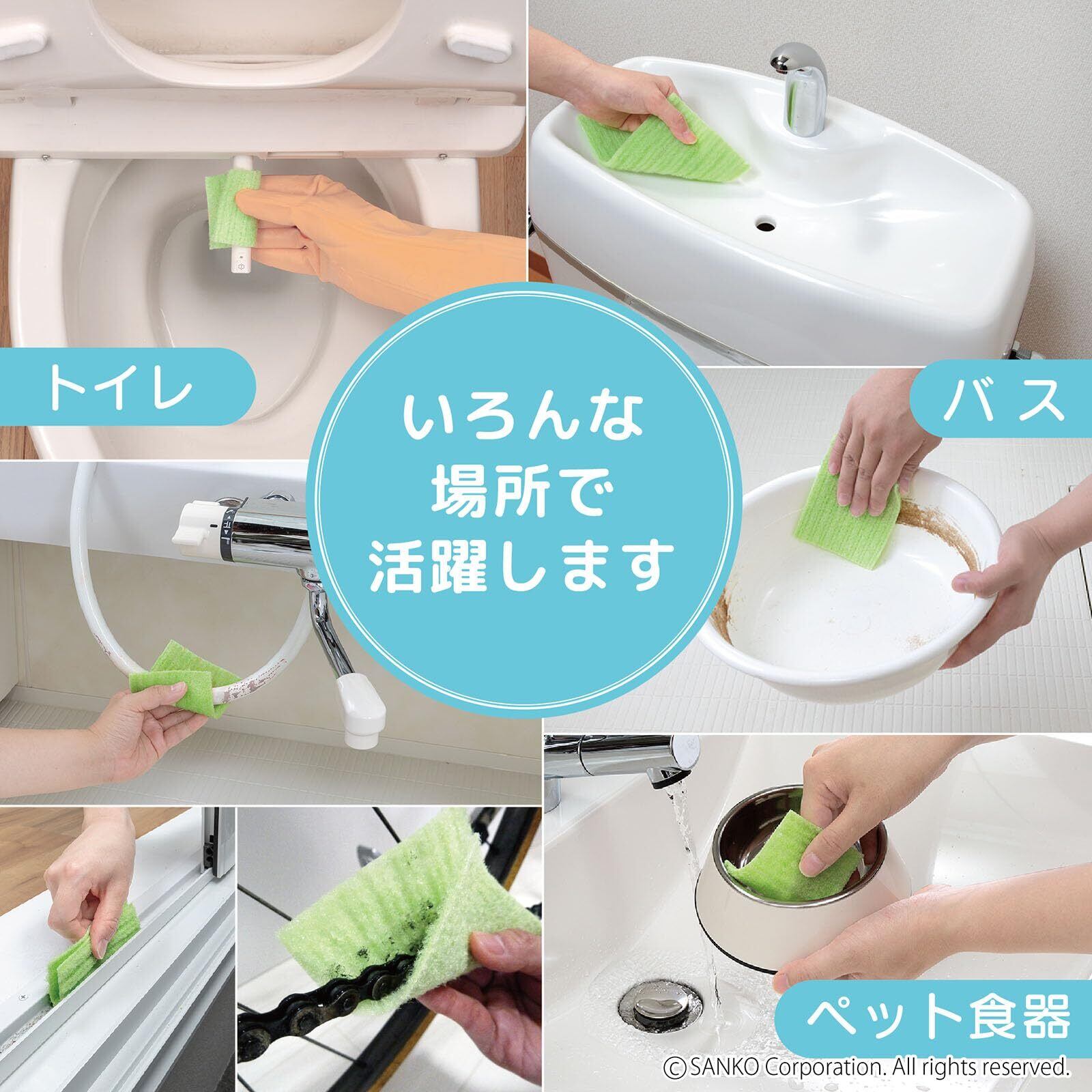 キッチンやバス、トイレなどいろんな場面に使用できます。傷をつけにくい柔らかい繊維使用しています。表の凹凸面を使って汚れを落としてください。