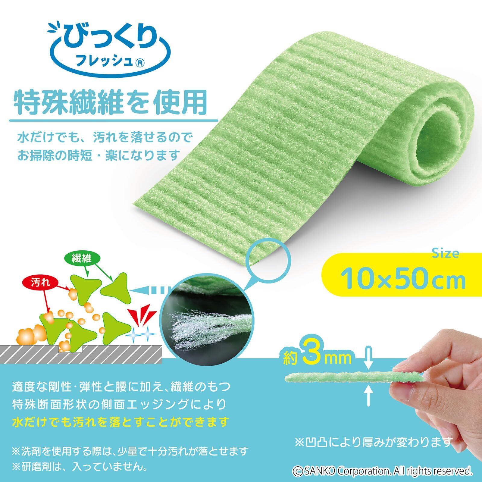 色:グリーン_スタイル:10×50cm(1枚)日本製 水だけでも汚れが落とせる特殊繊維 びっくりフレッシュ ロング ピカピカカットクリーナー グリーン シンク 10×50cm コップ 食器 日本製 キッチンスポンジ BF-76 サンコー