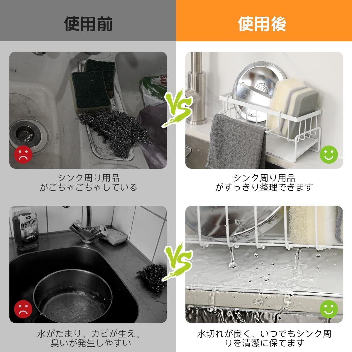 【スッキリ収納】シンクまわりのスポンジ、洗剤、ボトル、ふきんなどのゴチャゴチャがすっきり整理できます。水切れが良く、水たまりによるカビや臭いを抑えて、いつでもシンク周りを清潔に保てます。